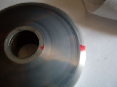 Самодельной фрезой сделанной наспех из колесика от зажигалки одетого на длинный болтик и зажатого гаечкой, вставленного в оборотистую дрель начинаем выбирать 1 мм на стенке вариатора прямо по следу от упора грузиков, так чтобы продолжение канавки под грузиком было как можно ровнее, а в месте упора грузика появилось углубление глубиной 1 мм. При выборке измерял штангелем расстояние от центрального упора до вставленного грузика, на стоке оно равно 9 мм, выборкой мы делаем 10 мм, вот что получилось, середину не трогаем всеравно упорная пластина упрется в ребра жесткости- направляющие канавок, а их подпиливать нежелательно.