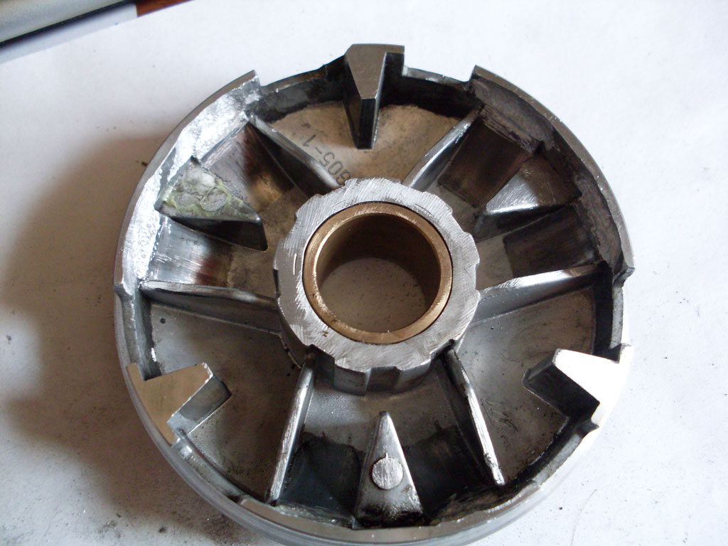 Чтобы не нарушить динамику пришла мысль выпилить на вариаторе те места куда упираются грузики и на узкое место вариатора одеть и приклепать кольцо которое будет новым упором для грузиков, таким способом увеличим выход грузиков по канавке на 2 мм, то есть на толщину стенки и тогда как раз выхода грузов хватит для полного поднятия ремня на вариаторе и утоплении в торке, но посмотрев на упорную пластину, видно что запас хода грузиков по ней всего 1 мм, а дальше нельзя грузы соскочат с упорной и вариатор заклинит в выдвинутом состоянии.