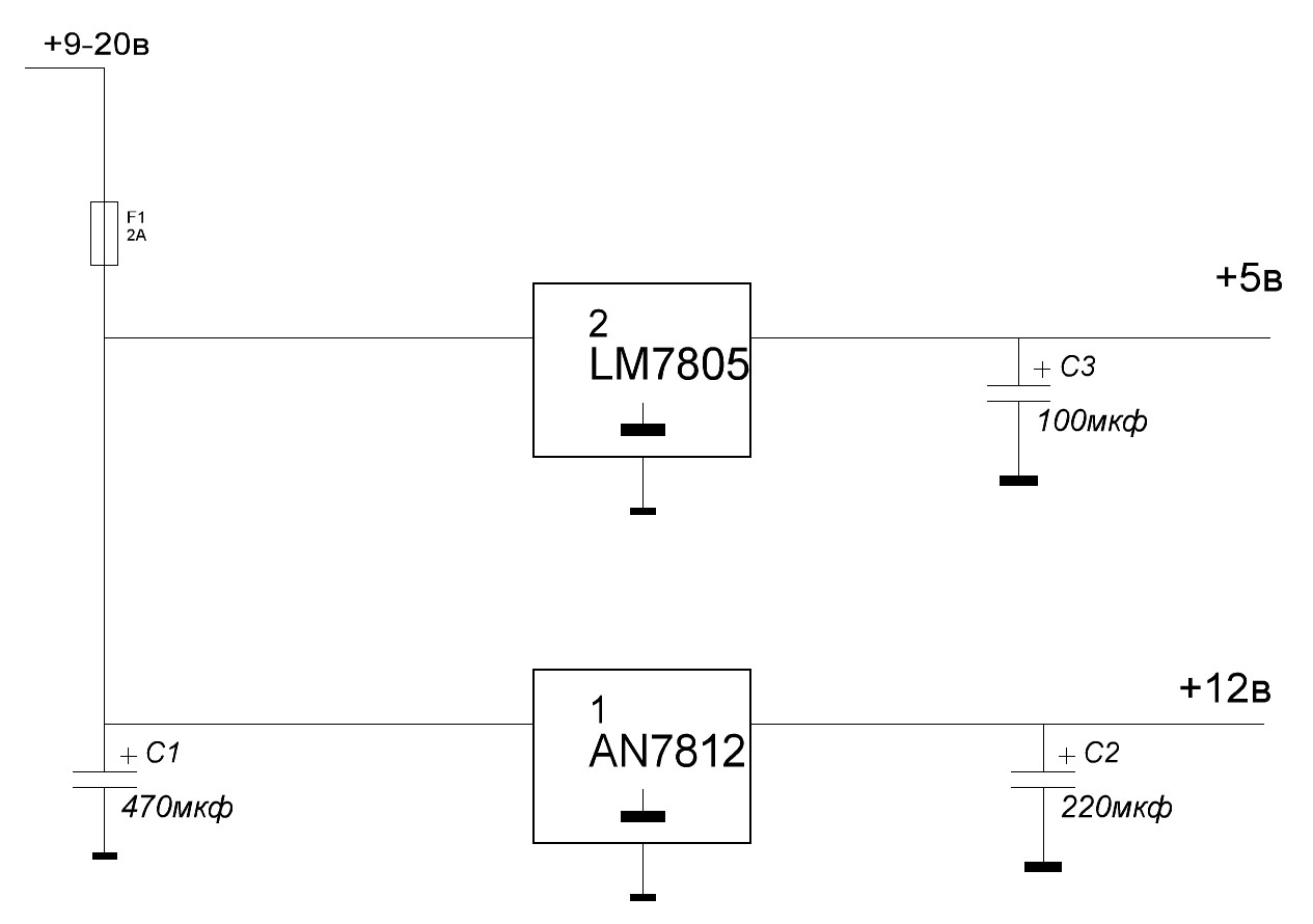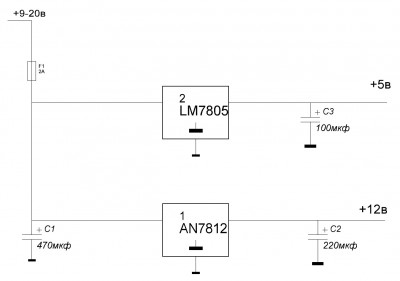 Отсюда можно запитывать различные микросхемные устройства с общим током до 1А на каждый стабилизатор...
