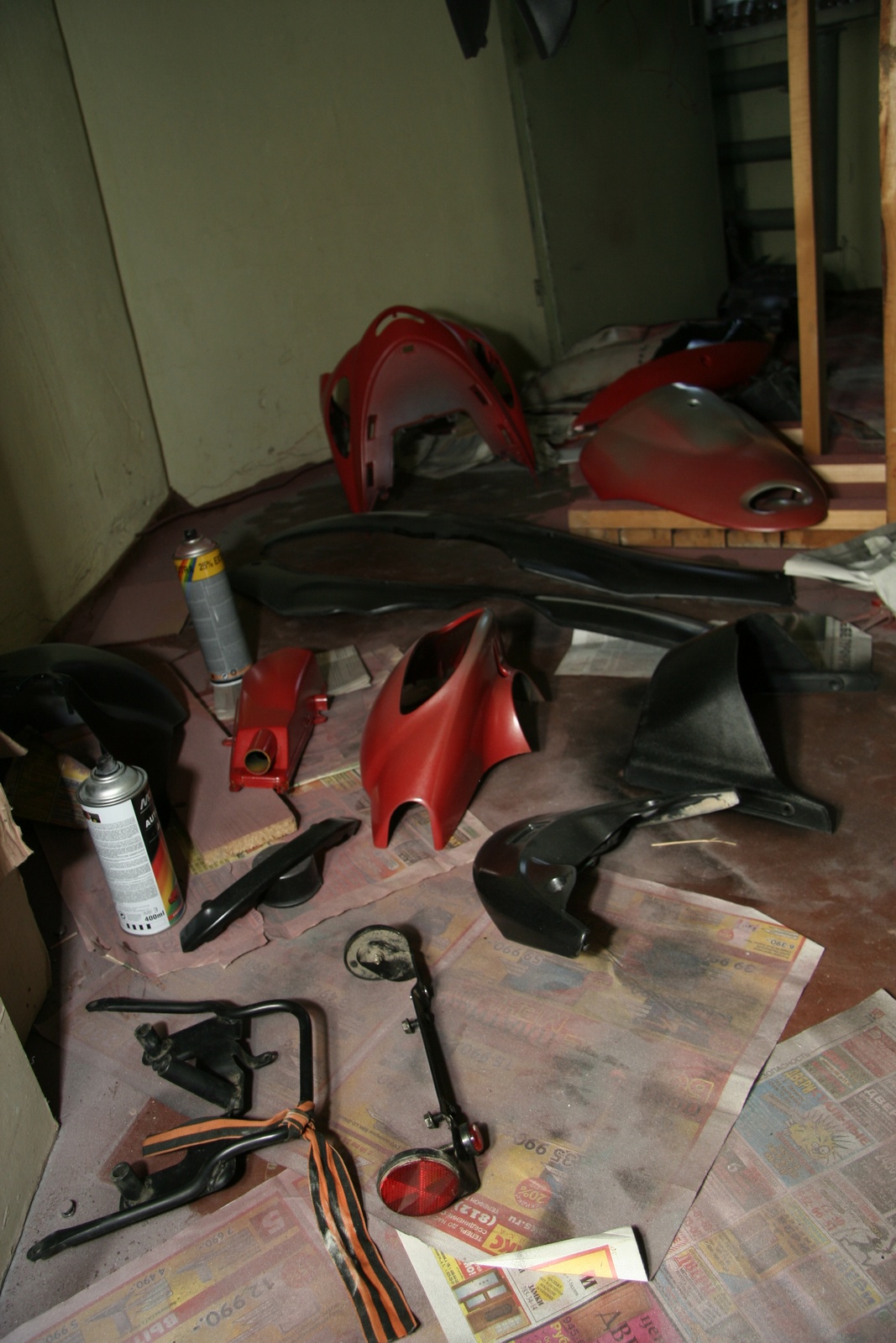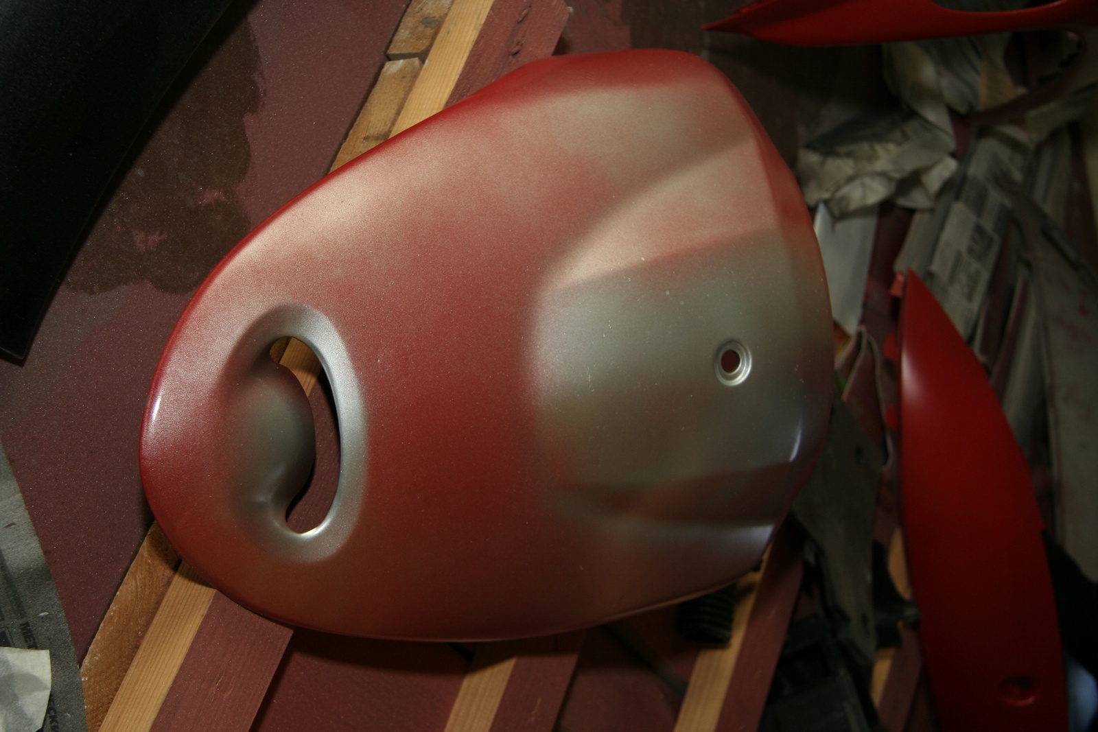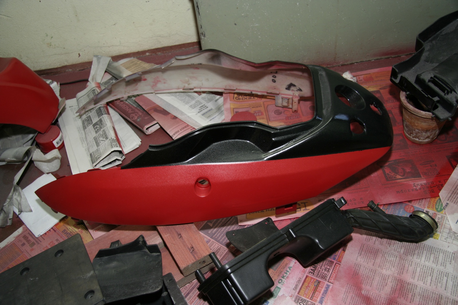 Бочина была разломана в хлам, выломаны куски из центральной пластины попы. Пришлось клеить, лепить недостающее из шпатлевки и потом только красить.