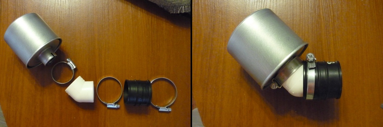 Хомуты и ПВХ отвод (45 градусов) куплены в сантехническом магазине (у